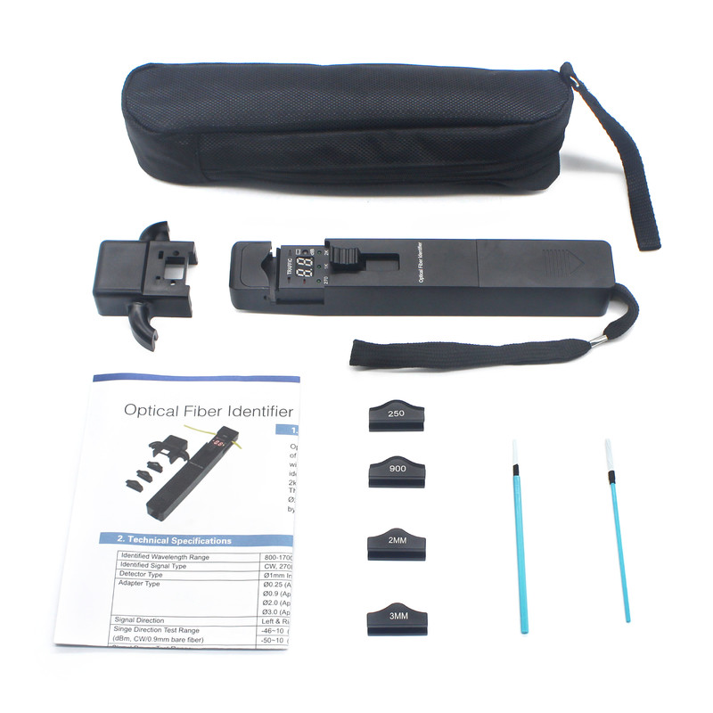 Il nostro identificatore di fibra ottica può identificare rapidamente la direzione della fibra trasmessa e visualizzare la potenza relativa del nucleo senza alcun danno alla fibra di piegatura.il suono intermittente è attivato. Questo identificatore di fibra ottica riconosce anche la modulazione come 270Hz, 1kHz e 2kHz. Quando vengono utilizzati per rilevare la frequenza, il tono continuamente udibile viene attivato.Sono disponibili quattro teste di adattamento: Ø0.25, Ø0.9, Ø2.0 e Ø3.0Questo identificatore in fibra ottica è alimentato da una batteria alcalina da 9 V.